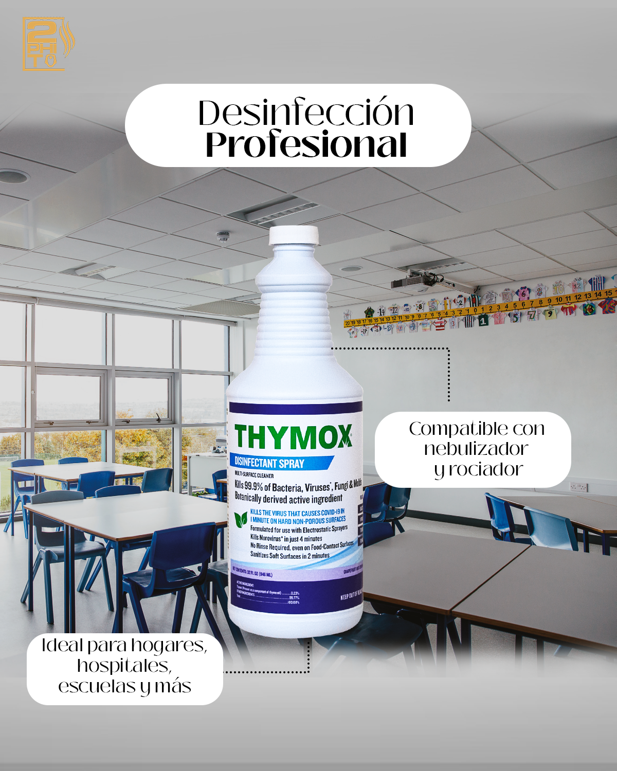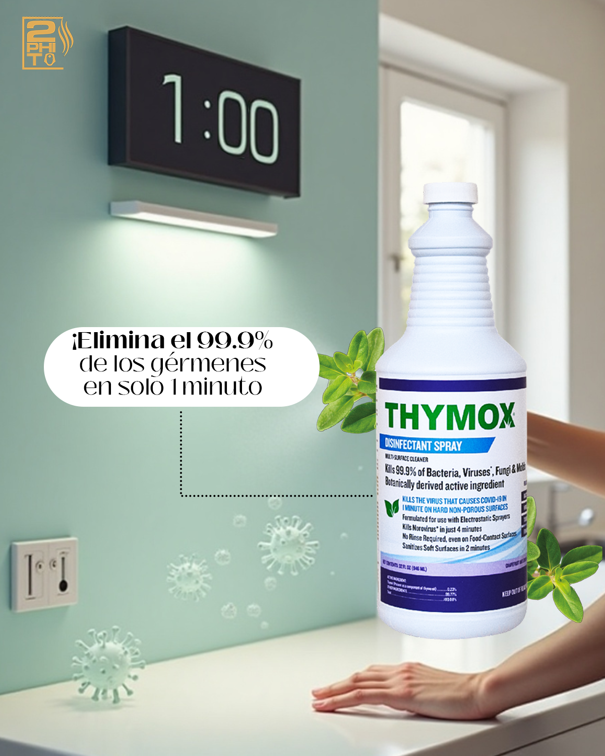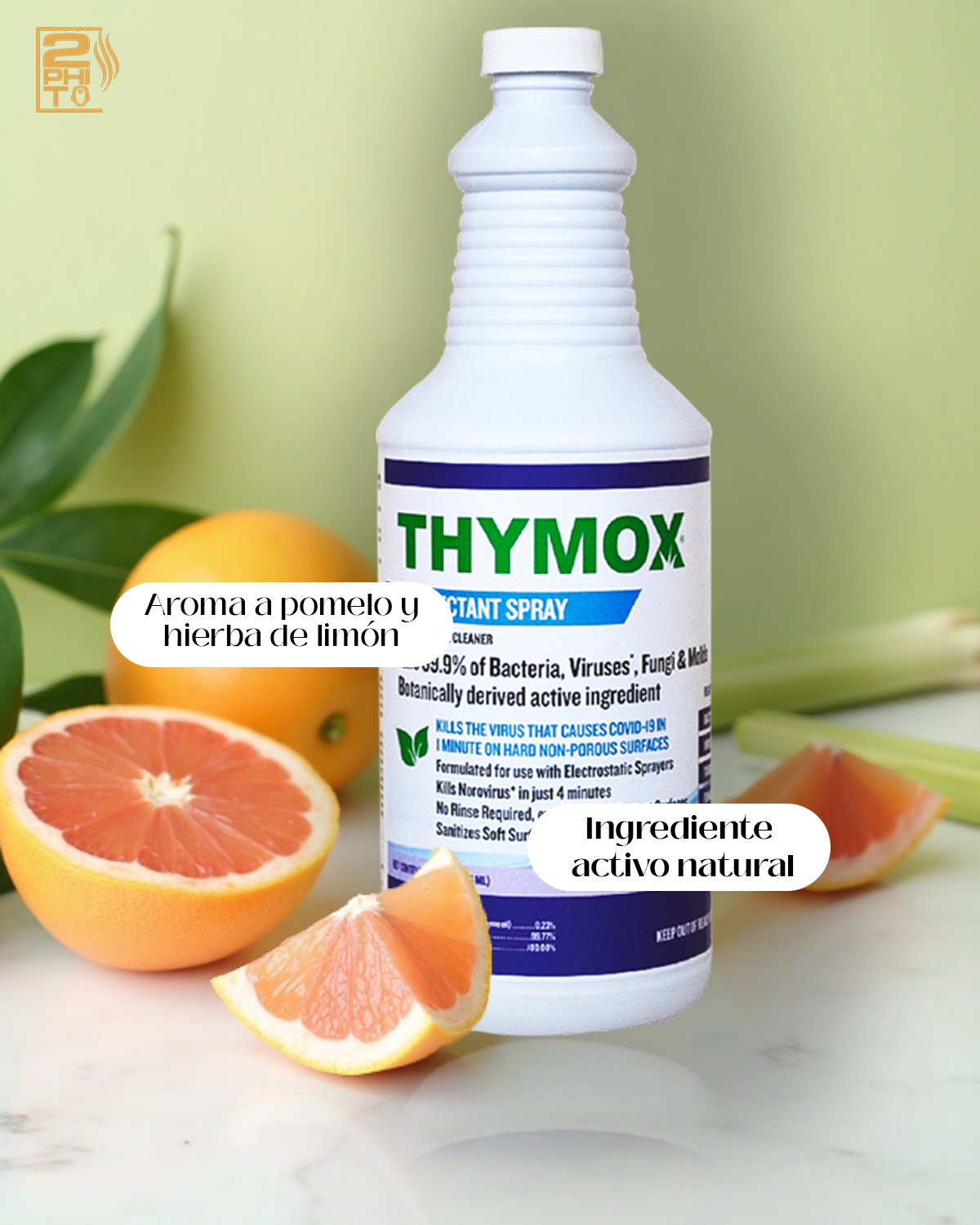 Button labelThymox Disinfectant Spray es un desinfectante botánico listo para usar, registrado por la EPA, que limpia, desinfecta, desodoriza y elimina alérgenos de forma segura en superficies duras y blandas. Con un ingrediente activo derivado de plantas y fragancia a pomelo y hierba de limón, elimina el 99.9% de los gérmenes, incluyendo SARS-CoV-2, sin necesidad de enjuague en superficies de contacto con alimentos.